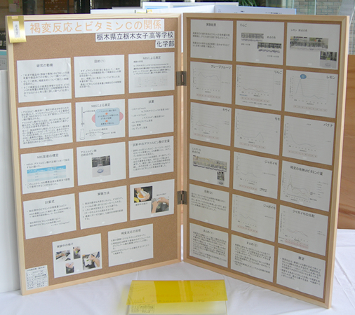 - ビタミンCには、野菜や果物が褐色に変化する反応を抑える働きがあると考え、酸化還元滴定の手法を用いてビタミンCの量を調べ、褐変反応との関係を探りました。