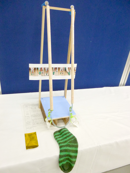 祖母は、かがむ動作が辛そうで、靴下をはく時に時間がかかってしまいます。そこで、楽に靴下がはける道具ができないかと思い、この作品をつくりました。