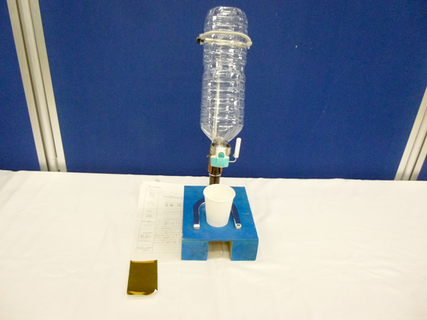 2リットルのペットボトルは重いため、飲み物をコップに注ぐときに、中身がはねて、こぼしてしまうことがあります。そこで、中身がはねない状態で、誰でも使いやすくコップに注ぐことができないかと思い、この作品をつくりました。