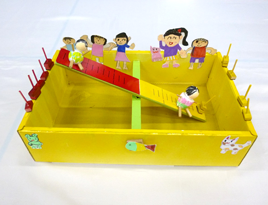 公園でシーソーに乗って遊んだとき、乗る場所を変えるだけで上がったり下がったりするのがおもしろかったので、私と妹で遊ぶシーソーゲームを作ることにしました。両端に私と妹の人形を置いてゲームをスタートします。周りに置いてあるおもりを交代で乗せていき、水平につり合えば合格です。