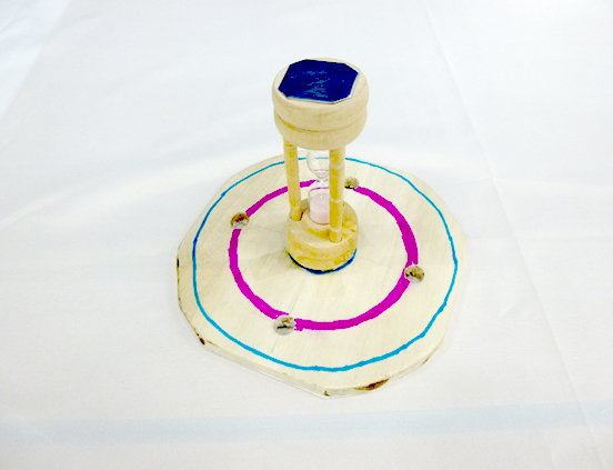 お湯を入れた後のカップラーメンのふたが、すぐに開いてしまうため、しっかり抑える専用のふたを考えました。大きなカップラーメンにも対応できるサイズにしました。そして、3分を計れるように、砂時計を付けました。この砂時計は磁石で付いているため、簡単にひっくり返すことができます。