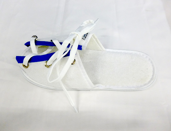 足を骨折してギブスで固定したとき、包帯や添え木の厚みで上履きやサンダルが履けなくなってしまった経験があります。そこで、足に包帯を巻いている人でも履けるスリッパを考えました。ひもでサイズを調節できるようにしたため、包帯を巻いている人だけでなく、足が大きい人や小さい人でも、脱げにくいスリッパになりました。