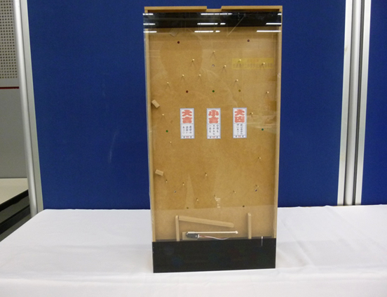 ペットボトルのキャップが投入されると、装置内に設置されたLEDが点滅します。キャップが、中央下の「あたりゾーン」に入ると占いが楽しめます。全体の制御にはマイコンを使用しました。