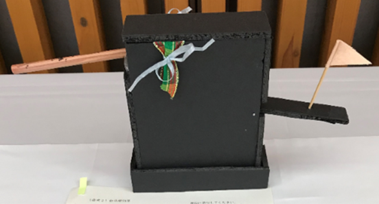 このえんぴつ削りは、削りかすがたまると、旗が上がります。シーソーの原理を利用して、片方に削りかすがたまると、旗のある反対側が上がるように作りました。旗が上がったら、削りかすを捨てます。これで、削りかすがたまりすぎるのを防ぐことができます。