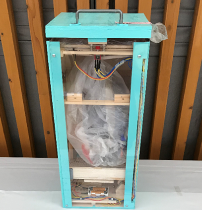 中に透明なゴミ袋をセットし、プラスチックゴミを入れてふたを下に押すと、モーターが作動します。そして、トレイが上がり、ゴミをつぶして小さくします。ゴミ箱の前の部分をアクリル板にすることで中のプラスチックゴミが見えるようにし、捨てたプラスチックゴミの量がよく分かるようにしました。