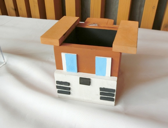 この作品は、動きを作るためにサーボモータとその動きを制御するためにマイクロビットを使っています。薬箱の引き出しの開閉と表示の変更をサーボモータにより行っています。スライダ・クランク機構により、回転運動を往復直線運動に変換しているので、薬箱の引き出しが前後に動きます。開閉には、少し離れた2枚のアルミホイルを同時に押す必要があります。それは、小さな子どもが引き出しを開けてしまい、間違って薬を飲まないようにする工夫です。