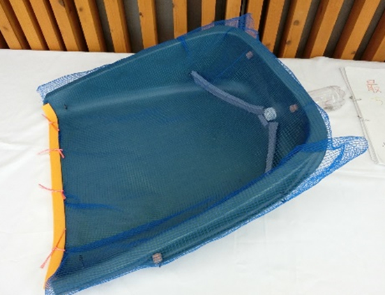 この作品は、ちりとりの上に網が張られていて、落ち葉等を集めた時に、砂や小石が網の下に落ちるので落ち葉を分けることができます。分けられた砂や小石は、ちりとりの後部に取り付けたペットボトルに、貯められるようにしました。また、ちりとりが重いと使いにくいので、できるだけ軽量な素材を使い、重くならないように工夫をしました。