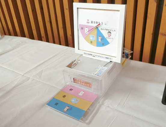 僕はよく薬を飲み忘れるので、薬の飲み忘れを防ぐことができる方法を考えて作った作品です。