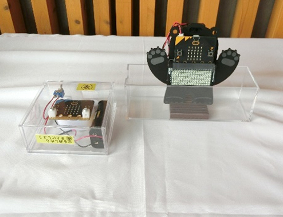 この作品では、マイクロビットの通信機能と明るさ検知機能を使っています。2つのマイクロビットを通信状態に設定し、火をつけた際に、キッチンにあるマイクロビットAを反転させ受光しない状況にします。すると受光が基準以下になり、もう一方のマイクロビットBに信号が届き、火がついていることを知らせる表示(火、fire)が出て、音が鳴ります。火を消した際に、キッチンのAを元に戻すことで受光が基準値以上になるため、Bの表示等が変わり、火がついていないことを示します。