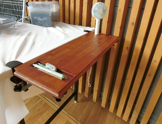 取り外しが可能な器具を使い、折りたたみ式の拡張テーブルを机に取り付けます。テーブルには筆記用具を置くための溝があり、教科書等でうっかり落としてしまうことも少なくなります。また、モバイルファンを設置できる穴もあり、使用者が快適に学習できるように工夫しました。