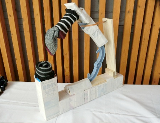 小さな子が簡単にできるようにするために、作業はシンプルで分かりやすいものとしました。布団の洗濯ばさみを利用して、上のでっぱりと下のペットボトルにくつ下をはかせるようにセットして、装置を閉じるとどんなくつ下も一瞬で「ぐるりんぱ」できます。装置を閉じた後に手を離すと、装置が自動で元の形に戻るように工夫してあります。
