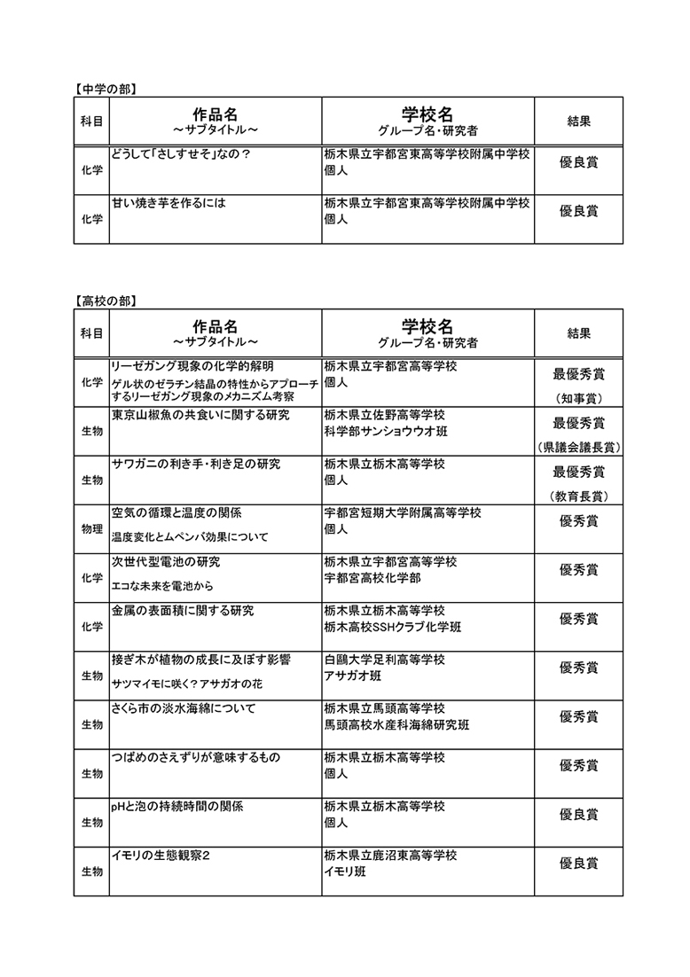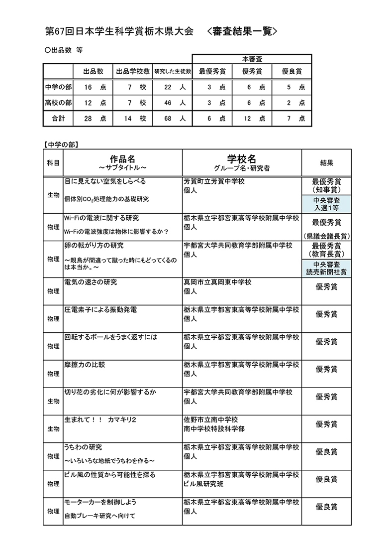 - 第67回 日本学生科学賞 栃木県大会 審査結果一覧(令和5年度)ダウンロード