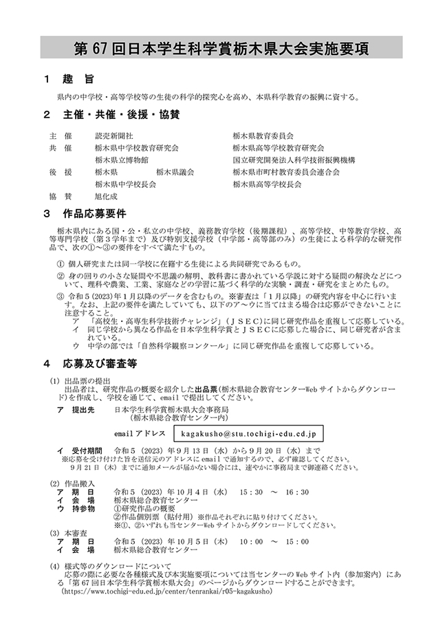 - ・第67回 日本学生科学賞栃木県大会 実施要項