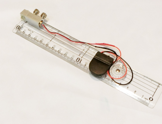 ドットレーザーをガラス管に当てると、ラインレーザーを作り出すことができます。レーザーを発生させる装置を定規に取り付け、レーザーをノートの補助線等に当てて、垂直の線や角度をつけた線を引くことで図形を書くことができました。また、壁に当てることで床面との垂直をみとることもできます。