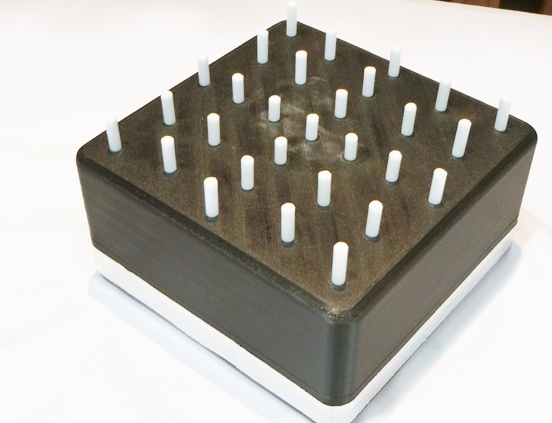 このホルダーはどこに物を置いても保持されるよう、ピンが物の形に沈み込む構造です。一定間隔に配置されたピンが沈み込むことで、どのような形の物でも保持することができます。高齢者や障がいを持つ方が、このホルダーのどこに物を置いても保持できるように構造を工夫しています。