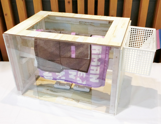 ちょうつがいを利用した中にある台に干す物を置きます。ハンディファンのスイッチを押して、下から風を送り、その風を利用して乾かします。