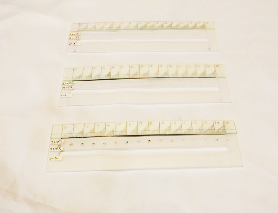 めもりを読み間違えないように、めもりの長さを変えて、1cmごとにガイドをつけました。真ん中の穴は、1cmごとに穴が開いているので、画鋲で固定すれば、コンパスにもなります。