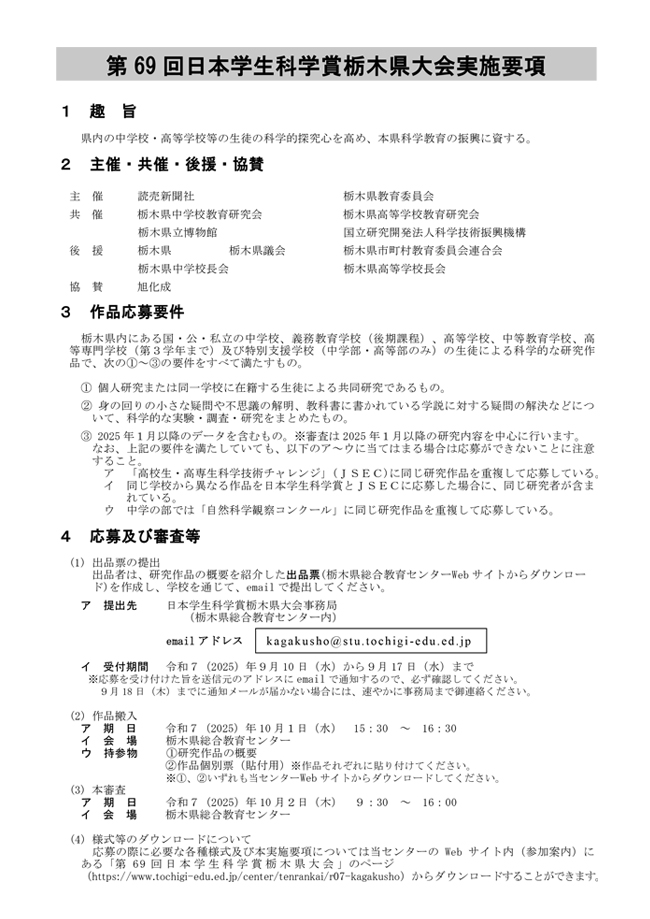 第69回 日本学生科学賞 栃木県大会 実施要項等(令和7年度) ( 更新)