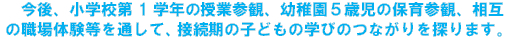 幼小接続期の保育・授業を実際に参観・体験することを通して、子どもの発達を理解し、幼小連携の推進者に求められる資質の向上を図る。 | ||||||||||||||||||||||||||||||||||||||||||||||