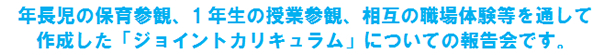 1 協議「報告に向けて」 報告「ジョイントカリキュラムを作成して」 2 講話「これから先生方に望むこと」 |