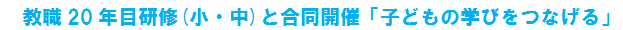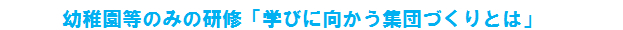1 講話・協議「子どもの学びをつなげる」※教職20年目研修(小・中)と合同 2 演習「幼小連携の視点からの教育課程の工夫・改善」 3 講話・演習「学びに向かう集団づくりとは」 |