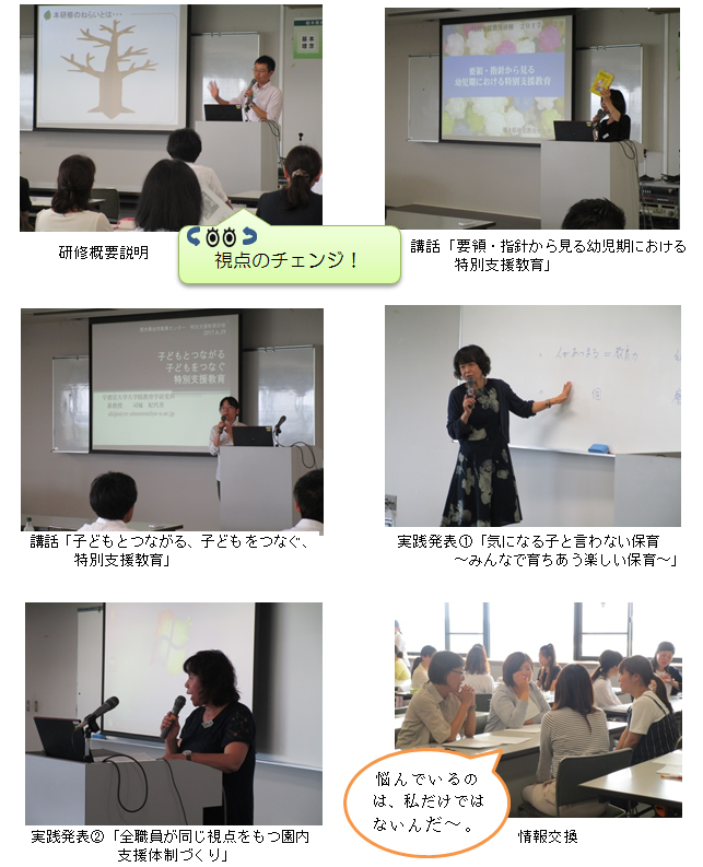 1 講話「要領・指針から見る幼児期における特別支援教育」 2 講話「子どもとつながる、子どもをつなぐ、特別支援教育」 3 実践発表①「気になる子と言わない保育~みんなで育ちあう楽しい保育~」 4 実践発表②「全職員が同じ視点をもつ園内支援体制づくり」 5 情報交換「第2日の実践報告にむけて」 |