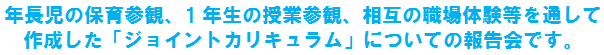 1 協議「報告に向けて」 報告「ジョイントカリキュラムを作成して」 2 講話「幼小連携推進者の今後の役割」 |