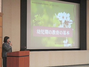 1 開講式 2 研修オリエンテーション 3 講話「保育者として」 4 講話「幼児期の健康管理と安全管理」 5 講話「幼児期の教育の基本」 6 講話・演習「保育の実践と省察」 |