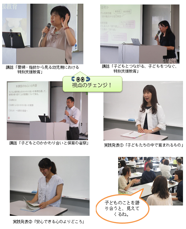 1 講話「要領・指針から見る幼児期における特別支援教育」 2 講話「子どもとつながる、子どもをつなぐ、特別支援教育」 3 講話「子どもとのかかわり合いと保育の省察」 3 実践発表①「子どもたちの中で育まれるもの」 4 実践発表②「安心できる心のよりどころ」 5 情報交換「第2日の実践報告にむけて」 |