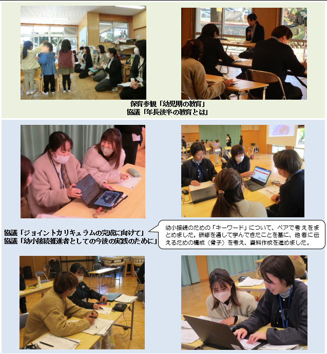 - 幼小の接続に大切なことを、実際の保育を見ながら、子どもの近くで考えることができたことも有意義だった。やはり、子どものやりたいという気持ちがとても大切であることを実感し、そのような気持ちを大切にした授業や活動にしていかなくてはいけないと思った。やる気は、いろいろな成長につながっていると感じた。