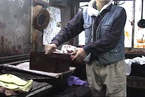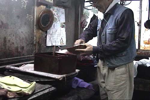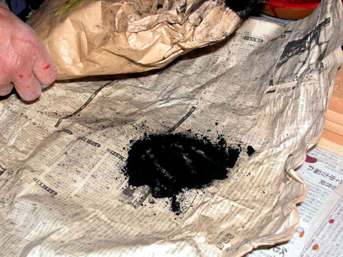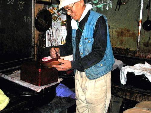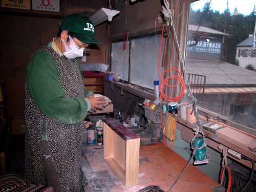カーボンブラックをかけ、模様によってペーパーを当てて黒色を落として、朱色を出します。