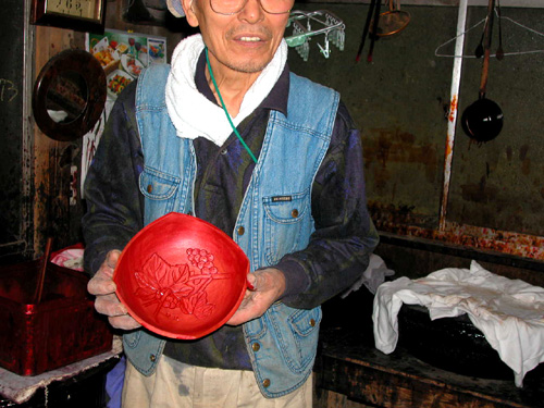 朱が塗られました。 堆朱塗りは朱の重ね塗りです。 1回塗ったあと24時間以上乾かして次を塗り重ねていきます。
