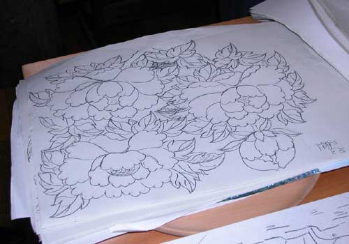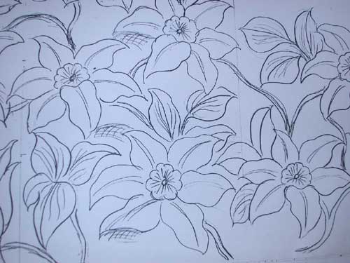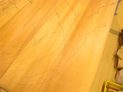 原寸大の図案をカーボン紙でタンスに写していきます。