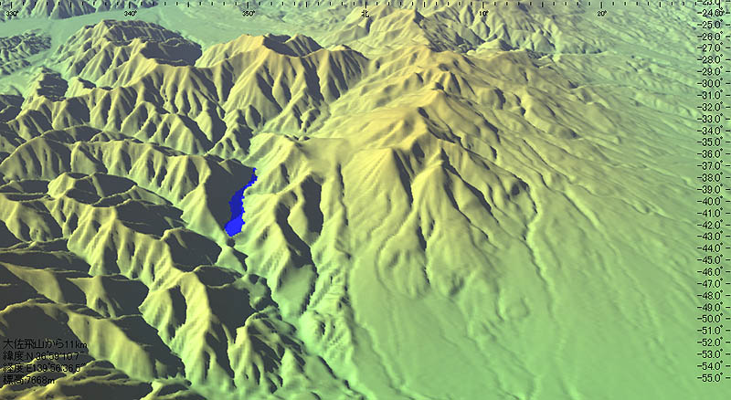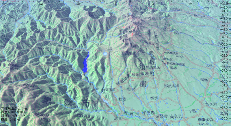 那須岳(なすだけ)の左下の平らな部分が沼原湿原です。その下のダム湖は深山ダムです。
