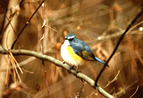 体の大きさ・特徴:スズメと同じくらいです。 体の色:オスは頭から背中・翼・尾が青で、脇腹がオレンジ色です・。 メスは茶褐色で、脇腹がオレンジ色です。 鳴き声:さえずりは「ちょっと見に来てくれ」と聞こえます。「ヒッ ヒッ」と鳴きます(ジョウビタキと似ています)。 見られる環境:夏は亜高山帯。冬は低地に下ります。ジョウビタキよりも薄暗いところが好きです。 季節:夏は山地。冬は平地。 その他の特徴:尾を細かく振ります。