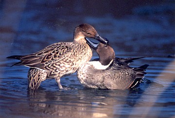 体の大きさ・特徴:マガモより小さいです。 体の色:オスの頭部は茶色で、首は白色で長いです。尾は黒色で長いです。 メスは茶色です。くちばしは黒色で両側が灰色です。 鳴き声:「プリッ プリッ」。 見られる環境と季節:県内全域の水辺。冬。 その他の特徴:井頭公園や羽田沼など、餌付けが行われている池や沼では一番人に近寄ってきます。