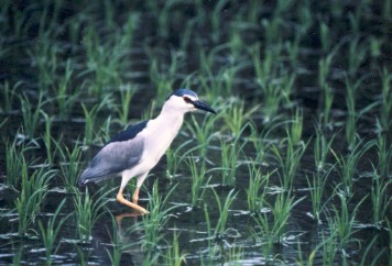 体の大きさ・特徴:カラスくらいの大きさで、首と足が長いです。 体の色:オス・メスとも灰色の体色で、頭と背は黒色です。くちばしは黒色で、足は黄色です。幼鳥は黒っぽい褐色です。 鳴き声:「クワッ クワッ」。 見られる環境と季節:県内全域の水辺。一年中。 その他の特徴:首を縮め、背中を丸めているのでずんぐりした格好に見えます。
