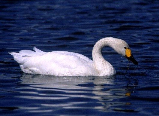 体の大きさ・特徴:カモよりずっと大きく、首が長いです。 体の色:オス・メスとも全身白色です。若鳥は灰色です。 鳴き声:「コホー コホー」。 見られる環境と季節:県内全域の水辺。冬。 その他の特徴:くちばしの黄色の部分が少ないのがコハクチョウで、多いのがオオハクチョウです。