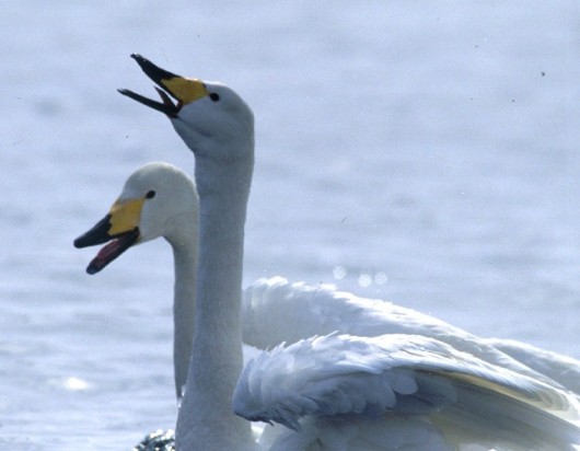 体の大きさ・特徴:カモよりずっと大きく、首が長いです。 体の色:オス・メスとも全身白色です。若鳥は灰色です。 鳴き声:「コホー コホー」。 見られる環境と季節:県内全域の水辺。冬。 その他の特徴:くちばしの黄色の部分が少ないのがコハクチョウで、多いのがオオハクチョウです。