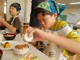 2日目は朝から元気に起きてきて、朝食の準備を頑張りました。皆で考えた健康朝食メニューは、ごはんに納豆、スクランブルエッグ、即席うどん、ヨーグルトでした。