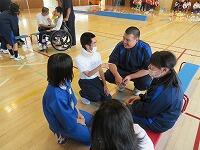 各学級に入った今工生とともに、朝の運動を行い、朝の会ではお互いに自己紹介をしました。その後、体育館に移動し、ボッチャのゲームを行いました。話し合って順番を決めたり、どの球が一番近いかを相談したりする様子が見られたほか、ゲームの合間に写真撮影や会話をして、交流を深めました。
