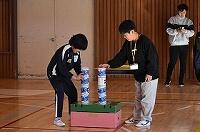 2人一組になってのゲーム「トイレットペーパー積み」で、協力して一緒に運んだり、積み上げたり、倒れたらグループの皆で集まって修復したりしているうちに、徐々に打ち解けてきました。