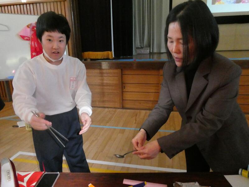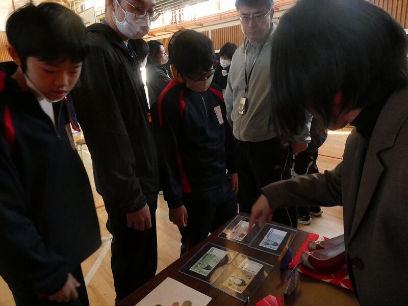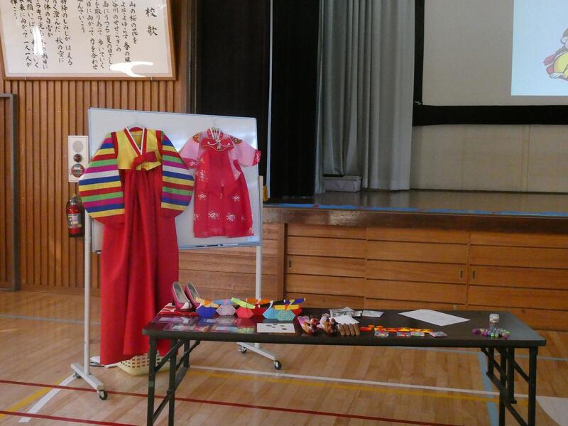 先生から、韓国のお金や遊びを実物で見せていただきながら教えていただきました。また、「チマチョゴリ」の衣装を実際に着せてもらった生徒もいて、満足そうな表情でした。