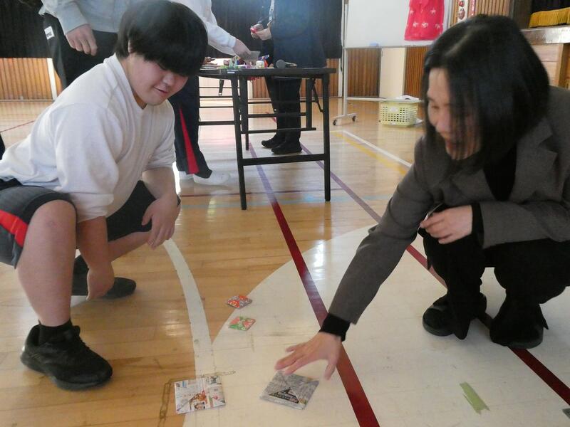 韓国の文化体験ということで「ゴンギ」というサイコロのような小さな四角い物で遊ぶゲームをしました。先生は簡単そうにやっていましたが、実際にやってみると難しく、それぞれのグループで挑戦しながら楽しい時間を過ごすことができました。
