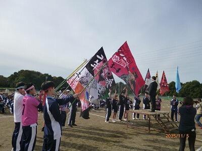 | クラスの応援団旗16本が風にたなびく選手宣誓 |