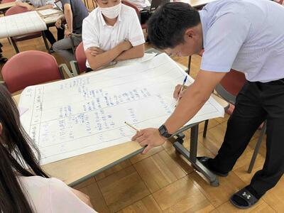部活動や授業中、学校行事での熱中症対策の成果や反省点を共有し、今後実施できる対策について検討しました。また、様々な活動場面において、生徒の救急搬送の必要が生じた場合に備え、グループでシミュレーションを行いました。さらに、県教育委員会事務局学校安全課の指導主事から、熱中症だけでなく、落雷事故や交通事故防止のための情報提供をしていただきました。