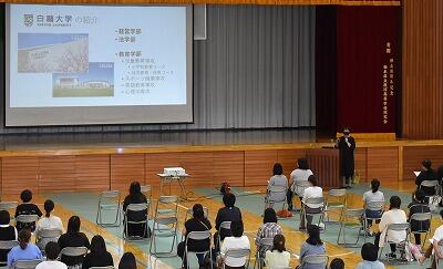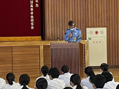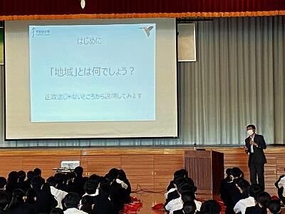 その導入として、10月21日(金)、宇都宮大学地域デザイン科学部教授、若園雄志郎氏をお招きして講演会を実施しました。テーマは「地域を学んで未来を創ろう」です。地域と連携して学ぶ意義や、地域の課題解決こそが日本の大きな問題に向き合う下地となることなど、大変わかりやすいお話で、生徒たちは熱心に聞き入っていました。