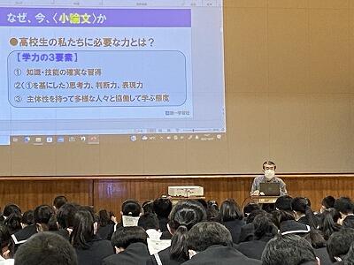 変化が著しく先の見えない現代社会においては、多様な人々と協働して納得解を導き出す力が求められており、「論理的思考力」「表現力」を身につけるために小論文の学習が欠かせないということでした。「作文」との違いや、1年生が陥りやすいパターンなどについてお話がありました。