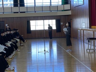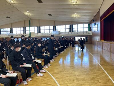最初に75名の生徒に対し、1カ年皆勤賞の授与がありました。その後各担任の先生方から受験に関するアドバイスや模試の振り返りについての話がありました。いよいよ4月から3年生です。受験生として自覚と高い目標を持って、進路実現のために頑張りましょう。