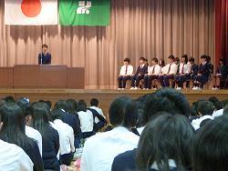 中間テスト最終日の22日、テスト終了後に第一体育館にて、交通講話および壮行会が行われました。交通講話は交通安全委員が主体となり、自分たちで作成したビデオの上映によって学校周辺の危険な場所が紹介され、正しい横断の方法や自転車の乗り方の説明がありました。通学路にあたっている人はもちろん、生徒全員、交通事故に遭わないように気をつけて登下校しましょう。壮行会では関東大会に出場する陸上部4名と弓道部男子女子各4名、合わせて12名への激励が行われました。校長先生や生徒会長からの温かい励ましの言葉をいただき、出場メンバーは皆やる気を新たにしていた様子でした。関東大会での健闘を祈ります。